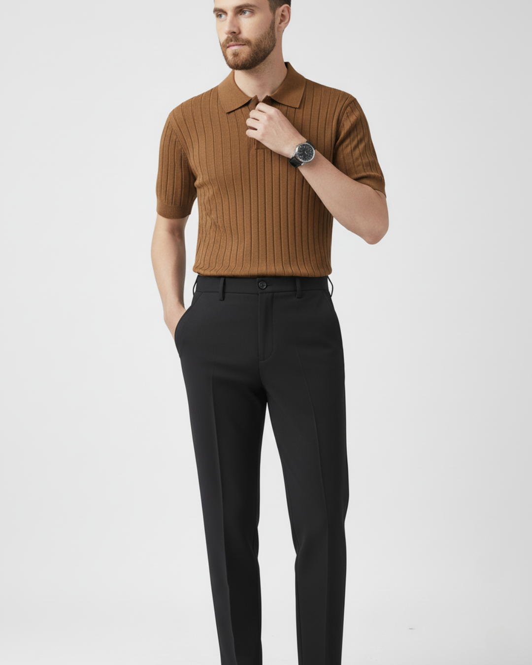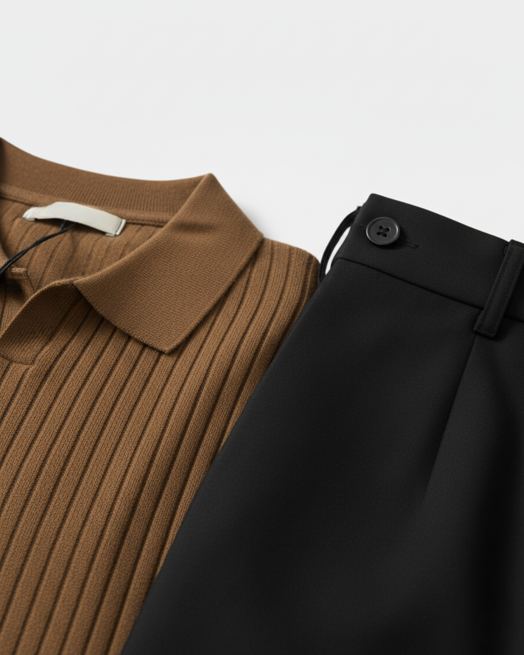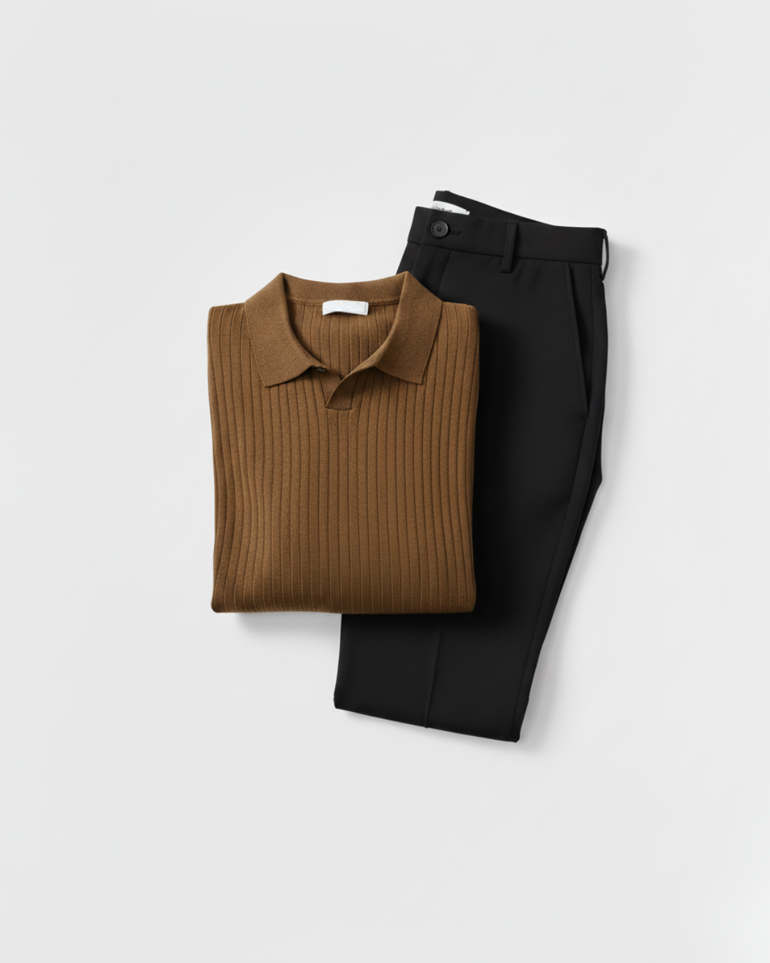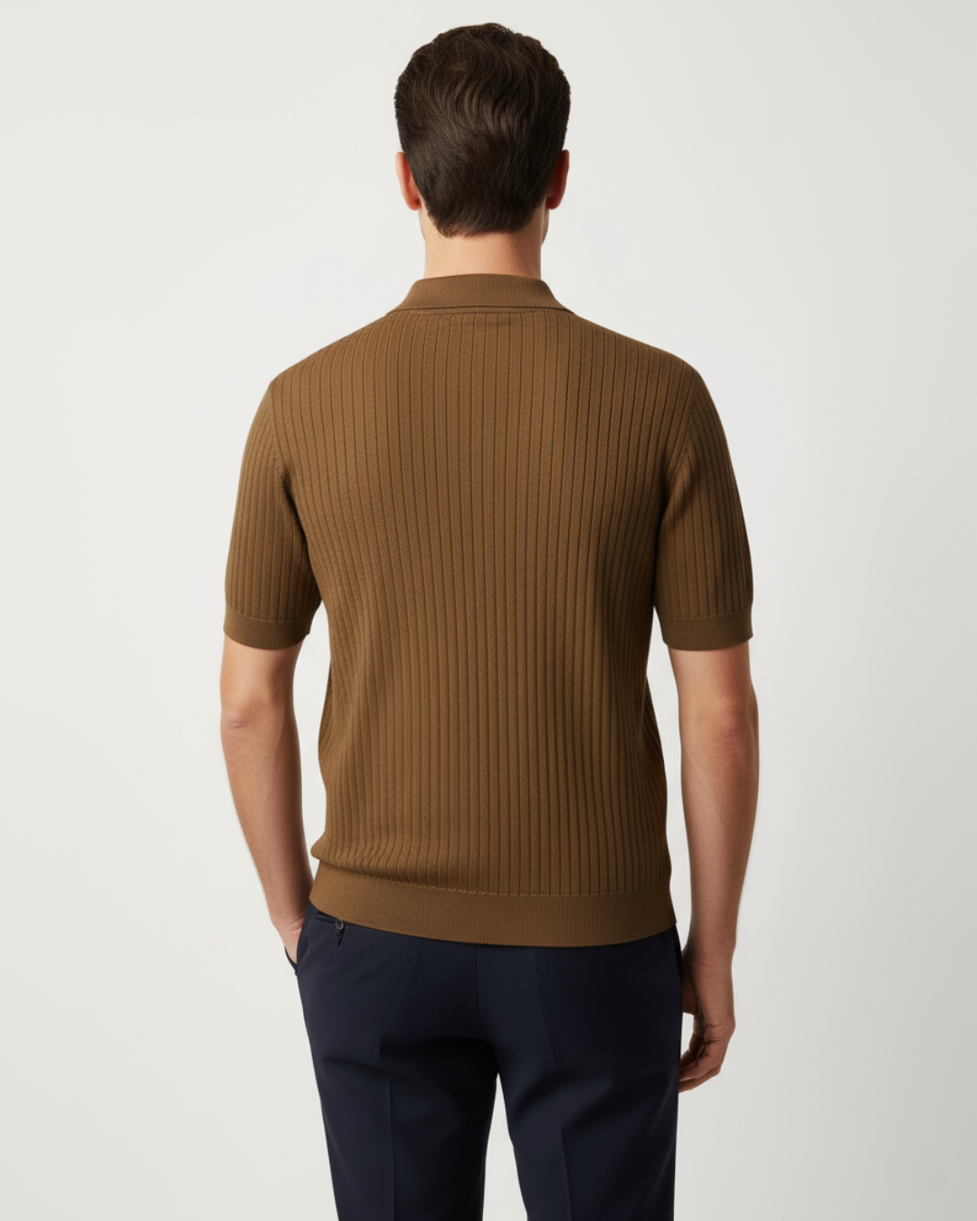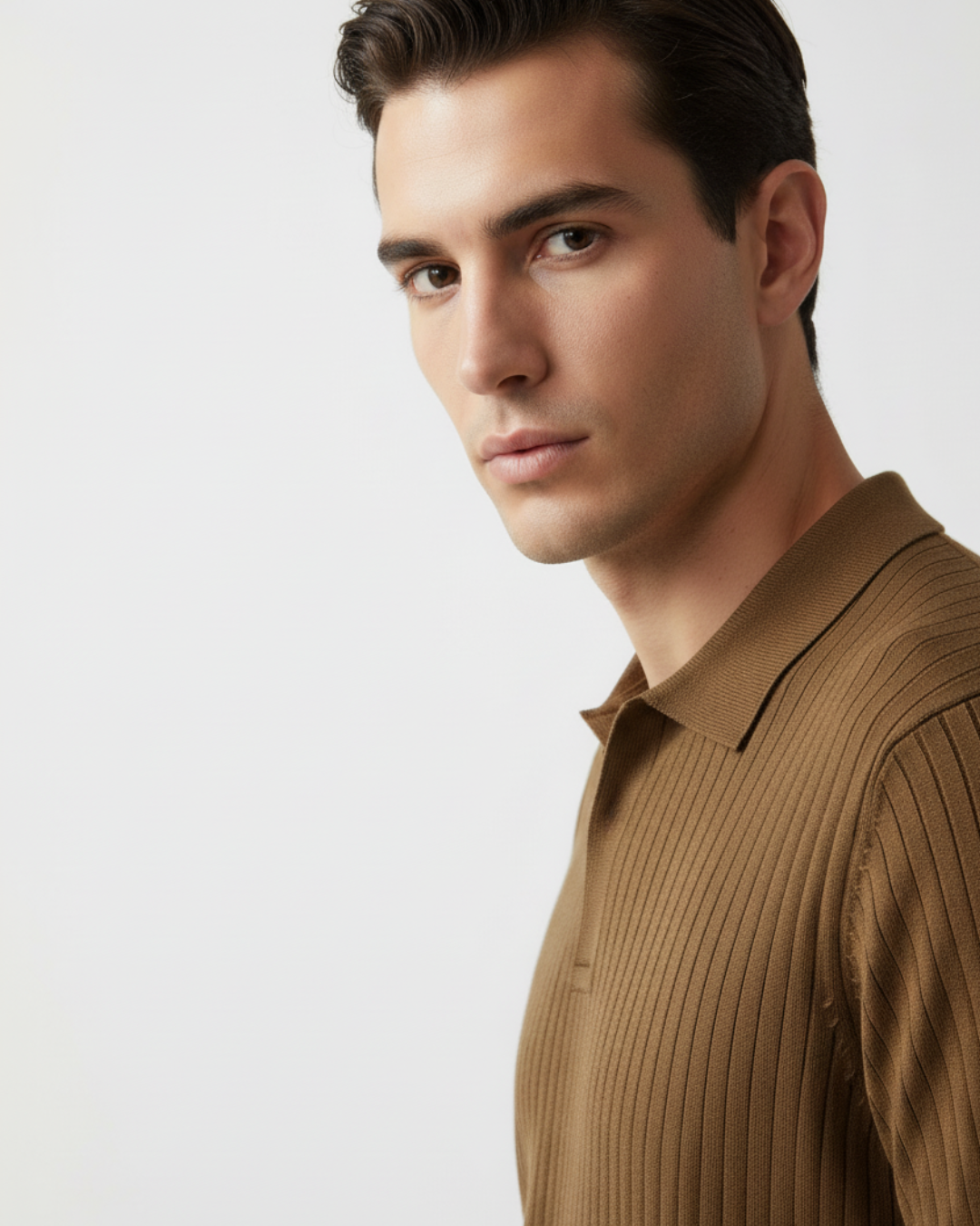 - • חולצת סריג חומה איכותית בגזרה אלגנטית
